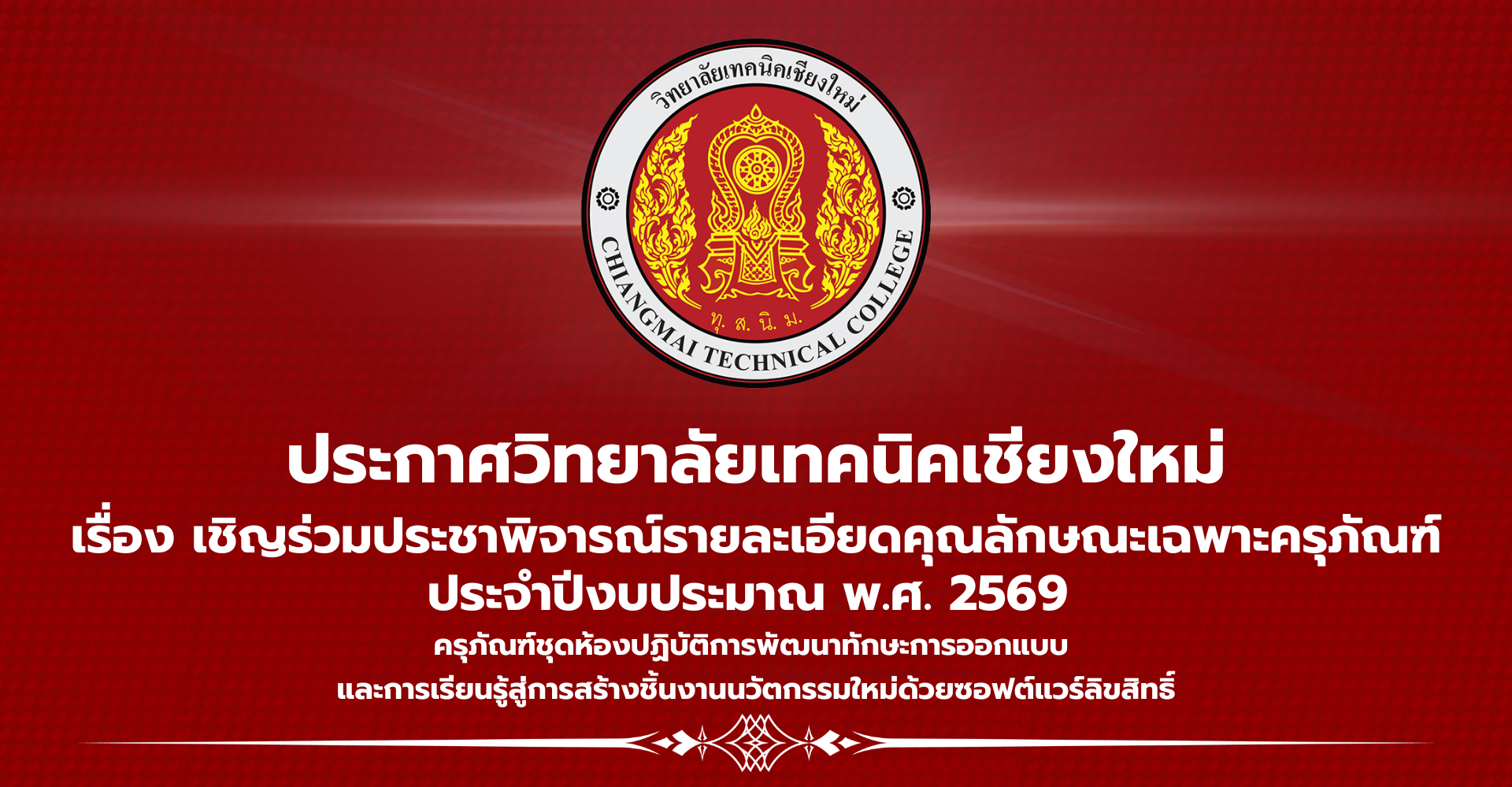 ประกาศวิทยาลัยเทคนิคเชียงใหม่ เรื่อง เชิญร่วมประชาพิจารณ์รายละเอียดคุณลักษณะเฉพาะครุภัณฑ์ป...