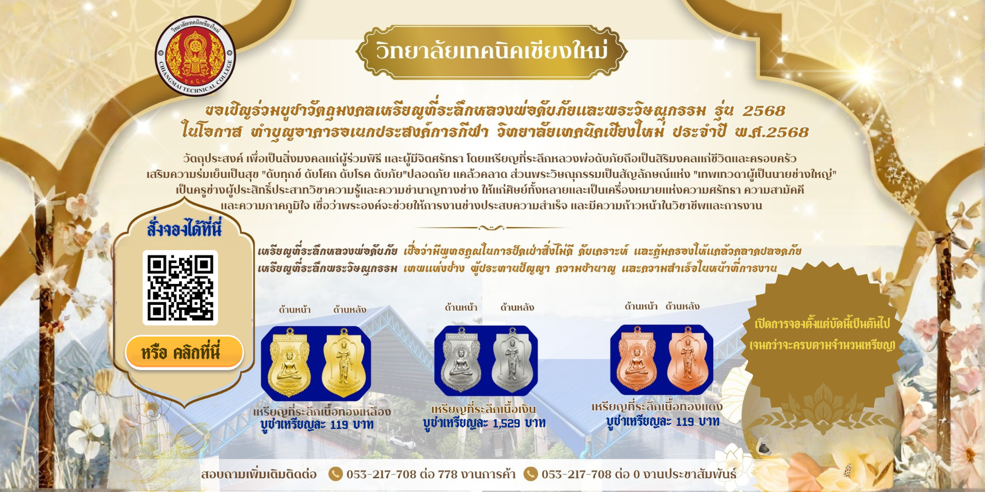 วิทยาลัยเทคนิคเชียงใหม่ จัดพิธีพุทธาภิเษก วัตถุมงคล เหรียญที่ระลึกหลวงพ่อดับภัย-พระวิษณุกรรม รุ่น 2568