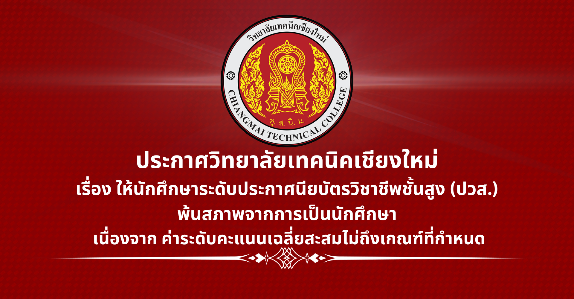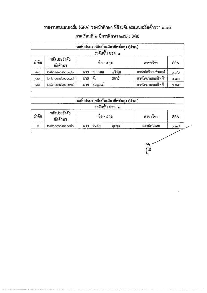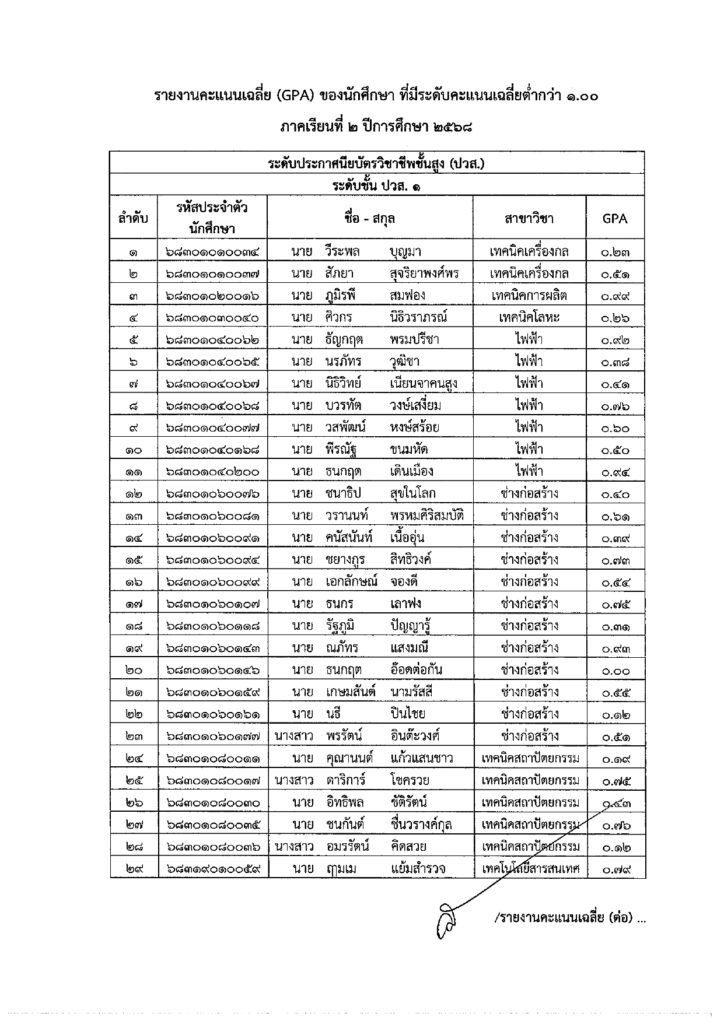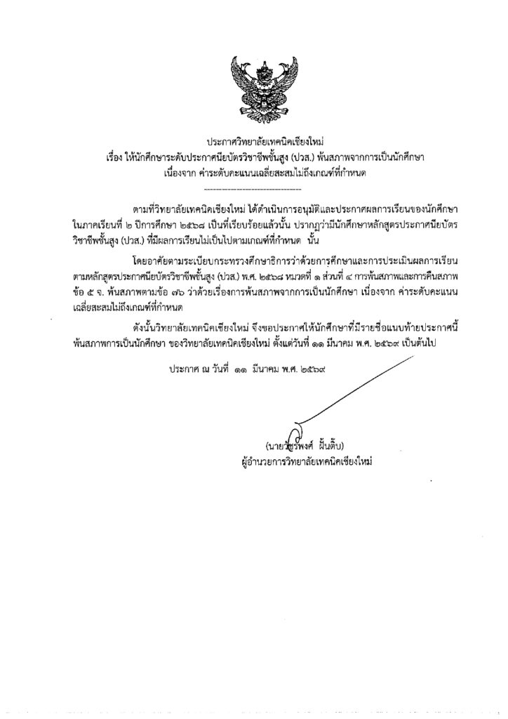 ประกาศพ้นสภาพจากการเป็นนักศึกษา ระดับ ปวส. เนื่องจากค่าระดับคะแนนเฉลี่ยสะสมไม่ถึงเกณฑ์ที่กำหนด