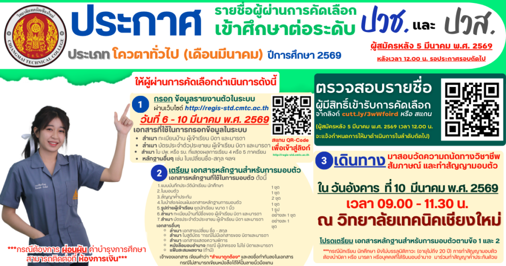 📌ประกาศรายชื่อผู้มีสิทธิ์เข้ารับการสอบคัดเลือกเพื่อเข้าศึกษาต่อ ประเภท โควตาทั่วไป รอบที่ 2 (เดือนมีนาคม) ประจำปีการศึกษา 2569 วิทยาลัยเทคนิคเชียงใหม่ 🚩