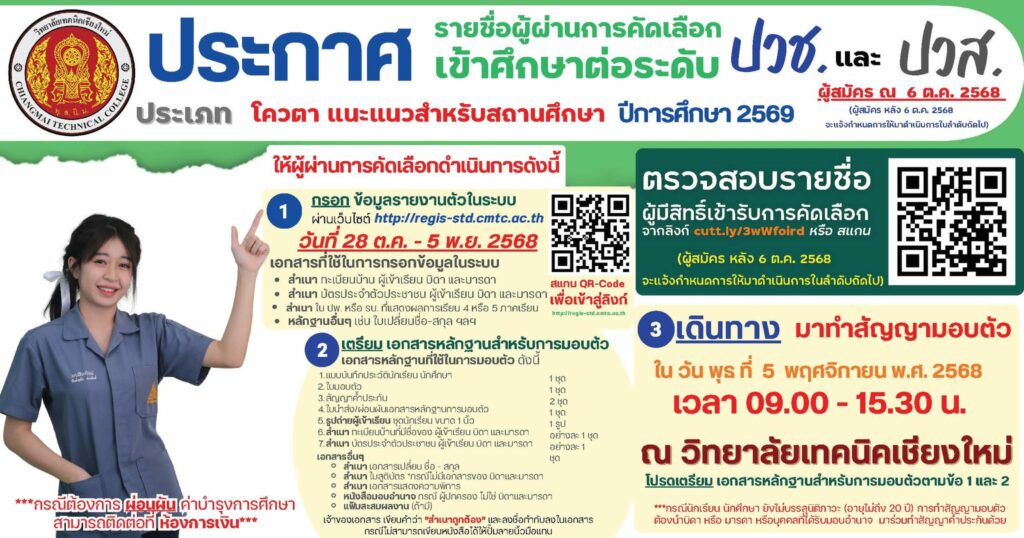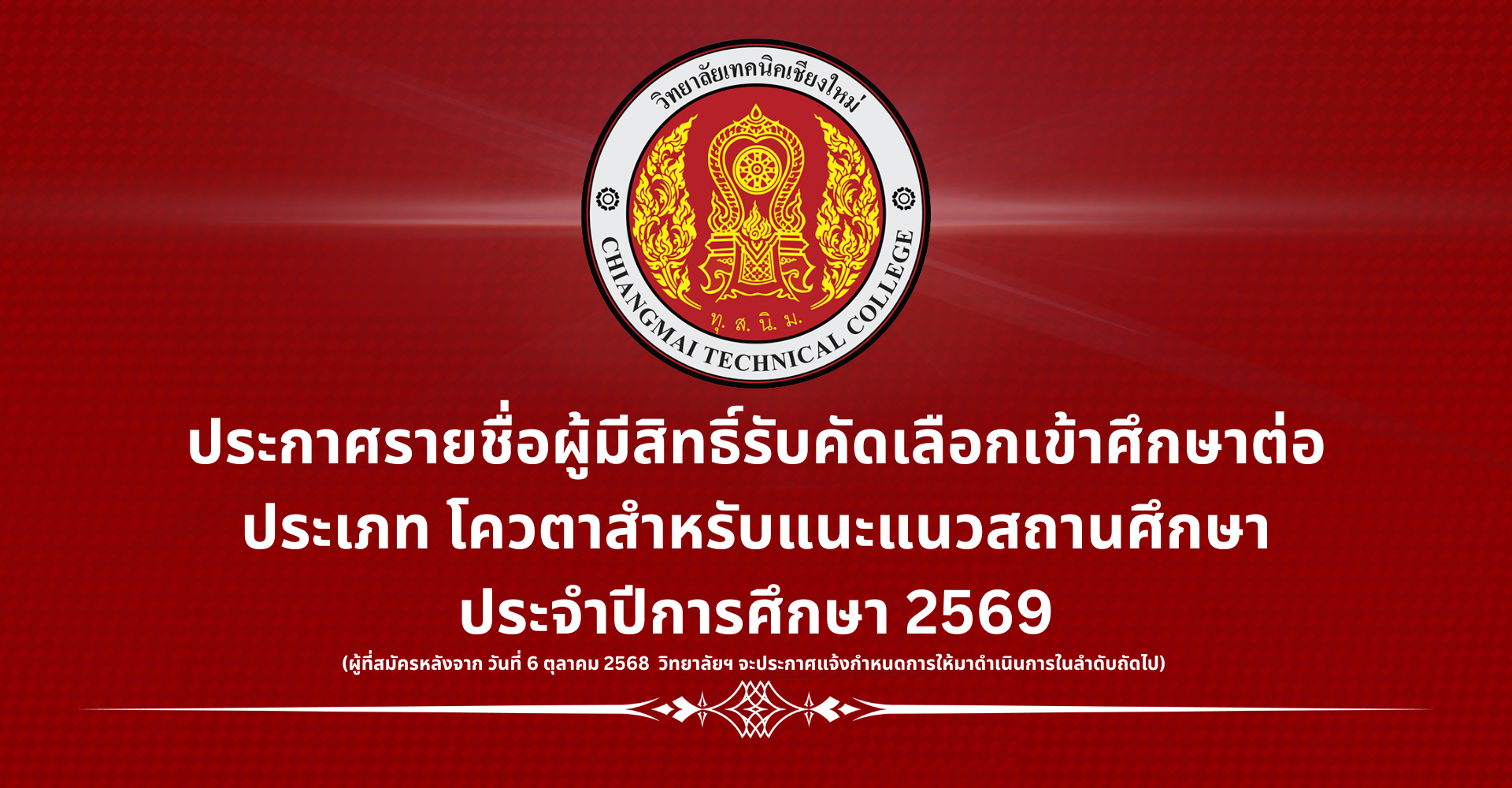 📌ประกาศรายชื่อผู้มีสิทธิ์รับคัดเลือกเข้าศึกษาต่อ ประเภท โควตาสำหรับแนะแนวสถานศึกษา ประจำปีการศึกษา 2569 วิทยาลัยเทคนิคเชียงใหม่ 🚩