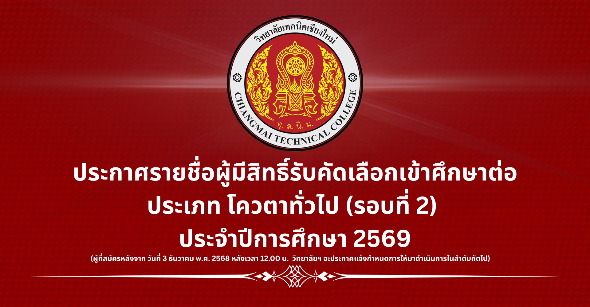ประกาศรายชื่อผู้มีสิทธิ์เข้ารับการสอบคัดเลือกเพื่อเข้าศึกษาต่อ ประเภท โควตาทั่วไป (รอบที่ 2) ประจำปีการศึกษา 2569 วิทยาลัยเทคนิคเชียงใหม่