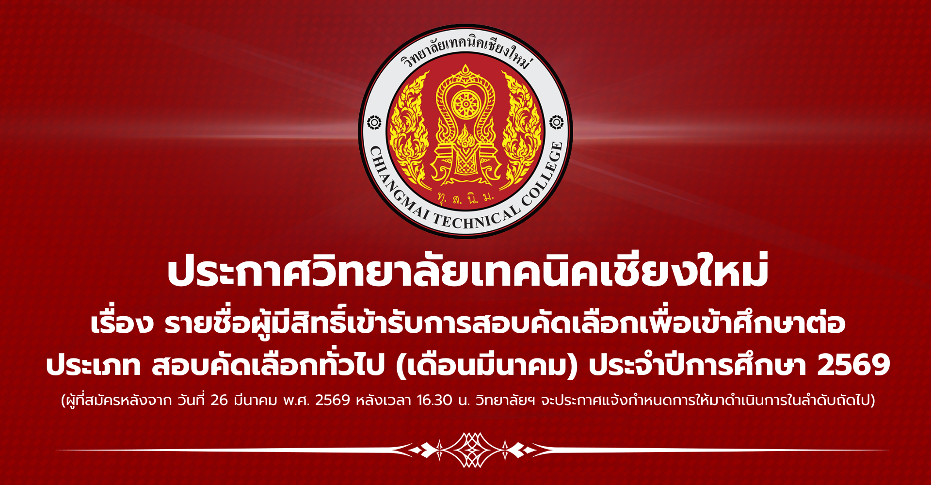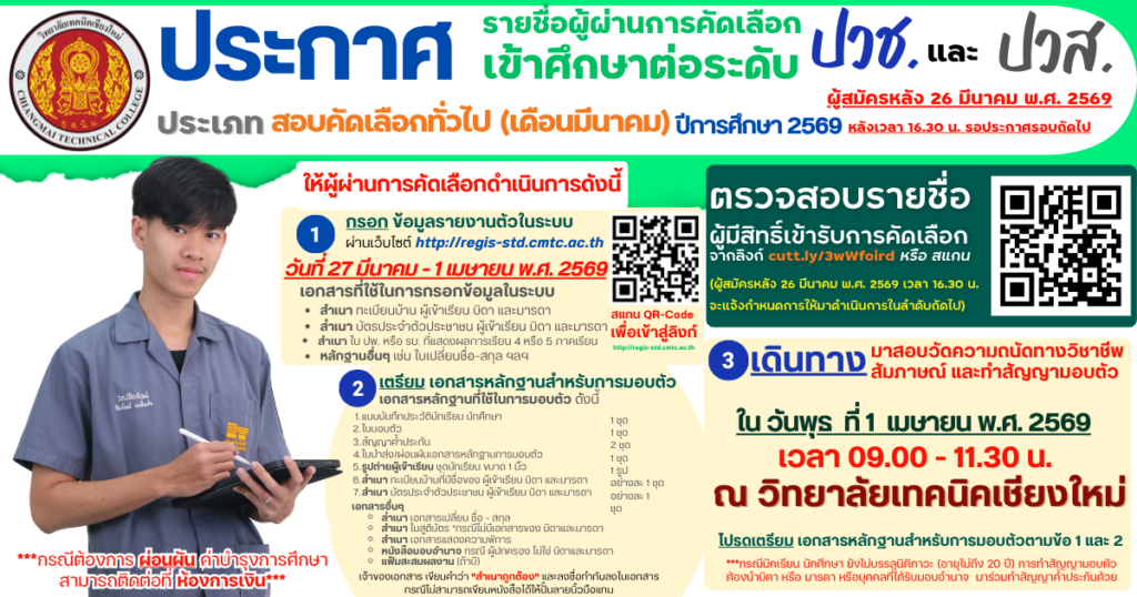 📌ประกาศรายชื่อผู้มีสิทธิ์เข้ารับการสอบคัดเลือกเพื่อเข้าศึกษาต่อ ประเภท สอบคัดเลือกทั่วไป (เดือนมีนาคม) ประจำปีการศึกษา 2569 วิทยาลัยเทคนิคเชียงใหม่ 🚩