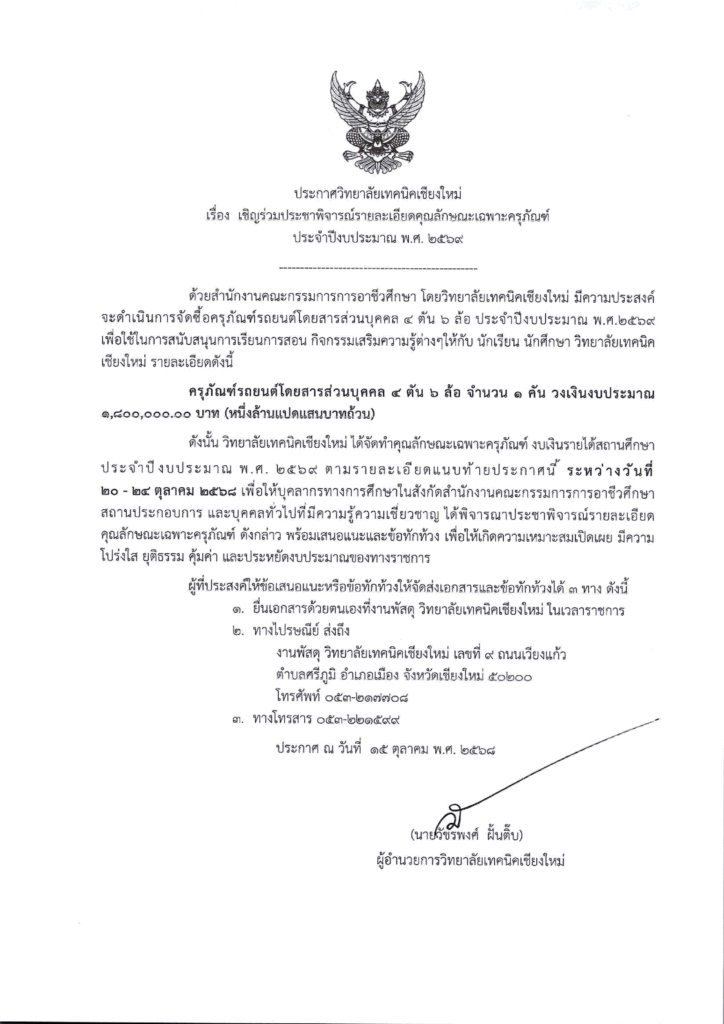 ประกาศวิทยาลัยเทคนิคเชียงใหม่ เรื่อง เชิญร่วมประชาพิจารณ์รายละเอียดคุณลักษณะเฉพาะครุภัณฑ์ประจำปีงบประมาณ พ.ศ. 2569