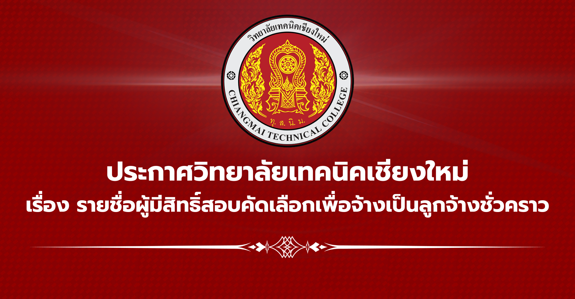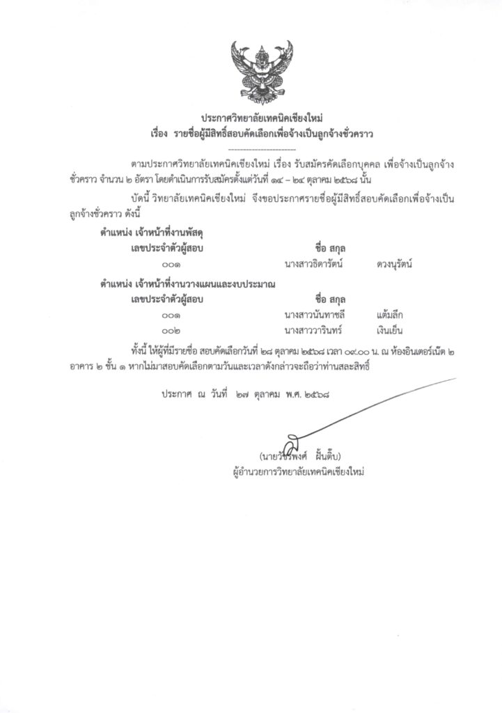 ประกาศวิทยาลัยเทคนิคเชียงใหม่ เรื่อง รายชื่อผู้มีสิทธิ์สอบคัดเลือกเพื่อจ้างเป็นลูกจ้างชั่วคราว