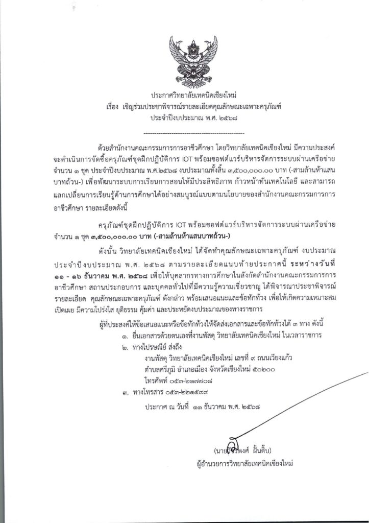 เชิญร่วมประชาพิจารณ์รายละเอียดคุณลักษณะครุภัณฑ์ ชุดฝึกปฏิบัติการ IOT พร้อมซอฟต์แวร์บริหารจัดการระบบผ่านเครือข่าย