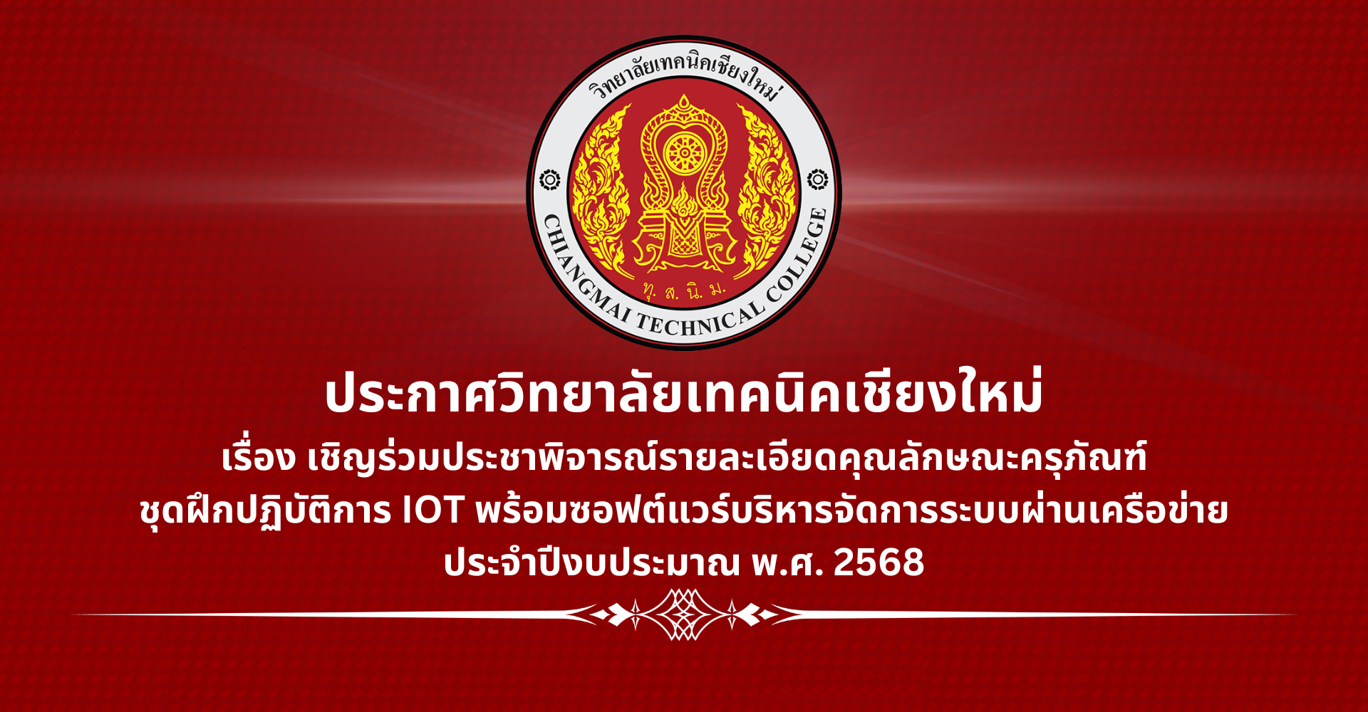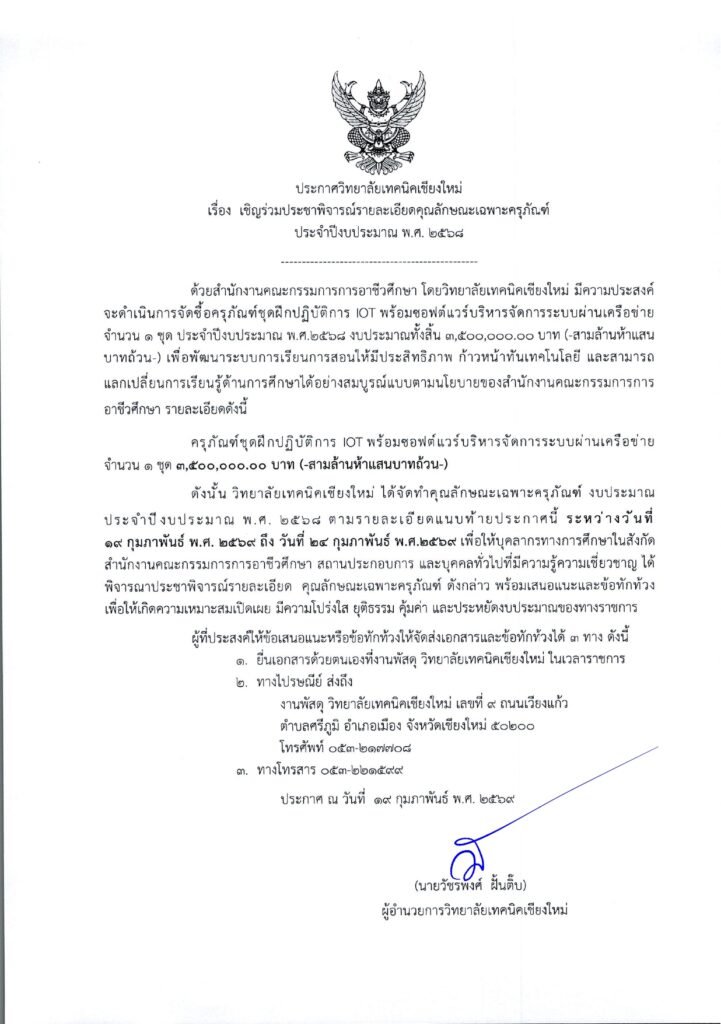 เชิญร่วมประชาพิจารณ์รายละเอียดคุณลักษณะครุภัณฑ์ ชุดฝึกปฏิบัติการ IOT พร้อมซอฟต์แวร์บริหารจัดการระบบผ่านเครือข่าย