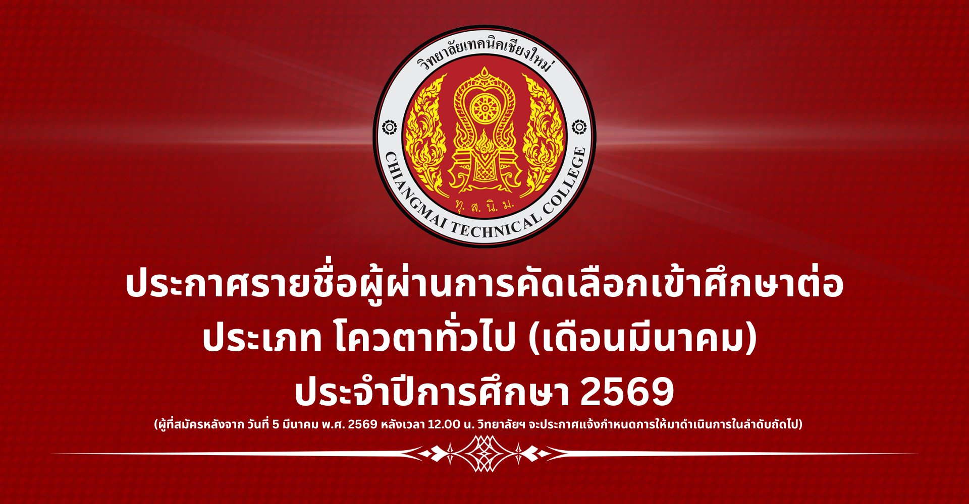 ประกาศรายชื่อผู้ผ่านการคัดเลือกเข้าศึกษาต่อ ประเภท โควตาทั่วไป (เดือนมีนาคม) ประจำปีการศึก...